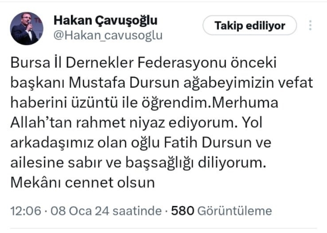 "Bursa İl Dernekler Federasyonu önceki başkanı Mustafa Dursun ağabeyimizin vefat haberini üzüntü ile öğrendim. Merhuma Allah'tan rahmet niyaz ediyorum. Yol arkadaşımız olan oğlu Fatih Dursun ve ailesine sabır ve başsağlığı diliyorum. Mekânı cennet olsun."