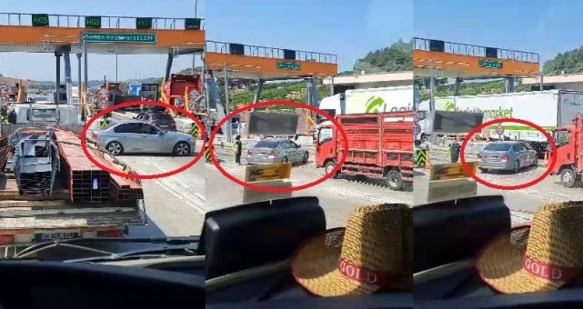 Bursa Kuzey Gişelerinde yanlış gişeye giren otomobil tırların arasından geçerek trafiği tehlikeye düşürdü.