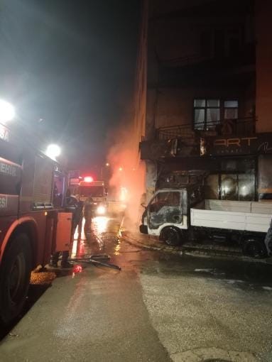 Yangın sonucu kamyonet kullanılamaz hale gelirken iş yerinde küçük çaplı hasar meydana geldi.