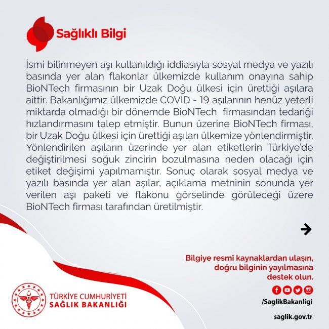 Bakanlığımız ülkemizde Covid-19 aşılarının henüz yeterli bir miktarda olmadığı dönemde BioNTech firmasından tedariği hızlandırmasını talep etmiştir. Bunun üzerine BioNTech firması bir Uzakdoğu ülkesi için ürettiği aşıları ülkemize yönlendirmiştir. Yönlendirilen aşıların üzerinde yer alan etiketlerin Türkiye'de değiştirilmesi soğuk zincirin bozulmasına neden olacağı için etiket değişimi yapılmamıştır. Sonuç olarak sosyal medya ve yazılı basında yer alan aşılar, açıklama metnin sonunda yer verilen aşı paketi ve flakonu görselinde görüleceği üzere BioNTech firması tarafından üretilmiştir” denildi.