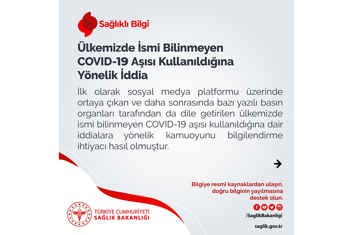 Sağlık Bakanlığı, sosyal medya yer alan ve bazı yazılı basın organları tarafından da yayınlanan 'Türkiye'de ismi bilinmeyen Covid-19 aşısı kullanıldığına' dair iddialara yönelik açıklamalarda bulundu. Açıklamada, “İsmi bilinmeyen aşı kullanıldığı iddiasıyla sosyal medya ve yazılı basında yer alan flakonlar ülkemizde kullanım onayına sahip BioNTech firmasının bir Uzakdoğu ülkesi için ürettiği aşılara aittir.