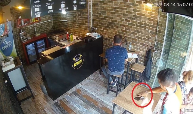 Müşterinin masada unuttuğu telefonu kaş ile göz arasında poşetine atan hırsız, dükkandan uzaklaştı.