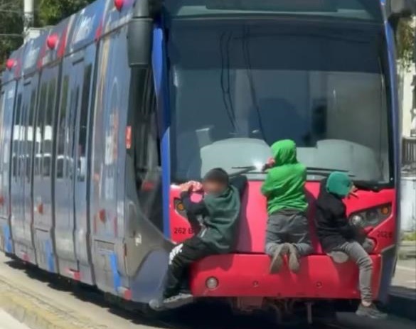 Hareket halindeki tramvayın arkasına tutunan çocuklar metrelerce bu şekilde ilerledi. Çocukların tehlikeli yolculuğunu gören vatandaşlar duruma tepki gösterirken, kimilerine bu görüntüler 'pes' dedirtti. Herhangi bir olumsuzluk yaşanmadan tramvaydan ayrılan çocuklar gözden kayboldu.