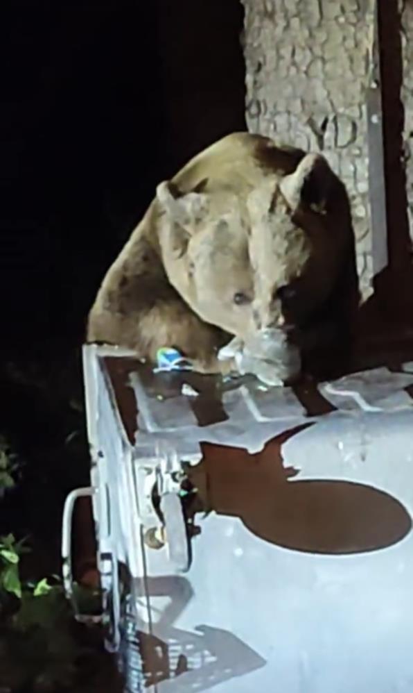 Turistik bölgede bir anda karşılarına ayı çıkan vatandaşlar, endişeli bakışlarla olan biteni izledi. Ayının çöp konteynerlerini tek tek devirerek yiyecek aradığı anlar cep telefonlarıyla saniye saniye kaydedildi.