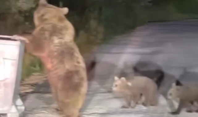 Bursa Uludağ'da boz ayı yavrularıyla birlikte çöp konteynerlerinde yiyecek ararken görüntülendi. Vatandaşlar tarafından cep telefonuyla kaydedilen ayı, kendisini fark edenleri görünce yavrularını koruma güdüsüyle bir anda saldırganlaştı. Panik yaşayan vatandaşlar canlarını zor kurtarırken, araca binip hızla bölgeden uzaklaştı.