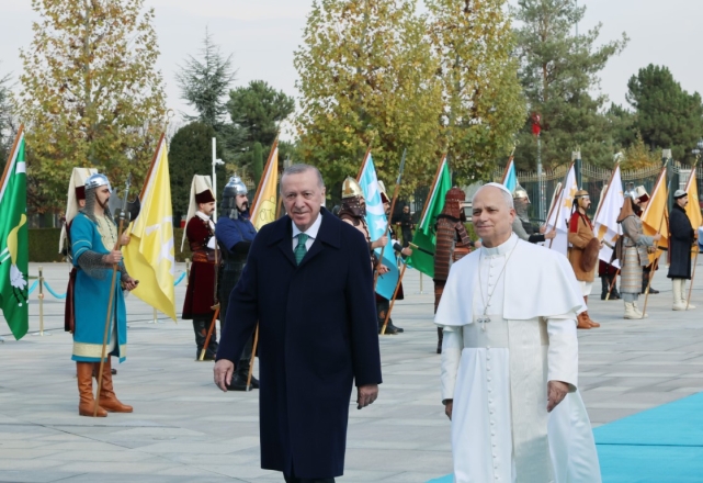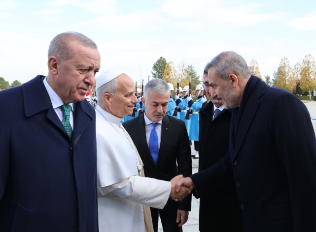 Cumhurbaşkanı Erdoğan, Papa 14. Leo'yu Cumhurbaşkanlığı Külliyesi'nin ana giriş kapısında karşıladı. Cumhurbaşkanı Erdoğan ve Papa 14. Leo'nun tören alanındaki yerlerini almalarının ardından, 21 pare top atışı eşliğinde iki ülkenin milli marşları çalındı.