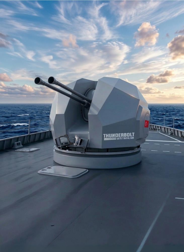 40 mm sınıfındaki sistem; dakikada toplam 600 atım ateş gücü, 736'ya kadar hazır mühimmat kapasitesi, 12 bin 500 m azami menzil, 1000 m/s çıkış hızı ve -13/+85 irtifa ile 360 yanca hareket kabiliyetiyle kısa reaksiyon pencereli, çoklu hedef ve doygun saldırı senaryolarına odaklanıyor. Kompozit kupola yaklaşımı ise düşük radar izi hedefiyle platformun imza yönetimi hedefleriyle uyumu destekliyor.THUNDERBOLT'un üretim sürecinin, Haziran 2022'de imzalanan Stratejik İş Birliği Anlaşması sonrası ivme kazandığı; Temmuz 2025'te Konya/Karapınar'da gerçekleştirilen kara atış testleriyle doğrulama safhasına geçilerek sistemin seri üretim fazına taşındığı belirtiliyor.