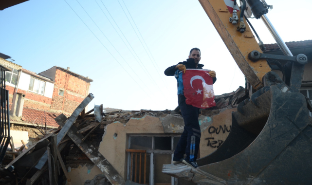 İş makinesi operatörünün bayrak hassasiyeti, yıkımı izleyen mahalle sakinlerini duygulandırdı.