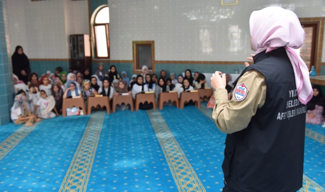 Kamu kurumları, okullar ve engelli bireylerin yaşadığı evleri ziyaret ederek vatandaşlara eğitim veren ekipler, yaz tatilinin başlamasıyla birlikte de camilerde Kur’an kurlarına devam eden çocuklara afet farkındalık eğitimleri veriyor.