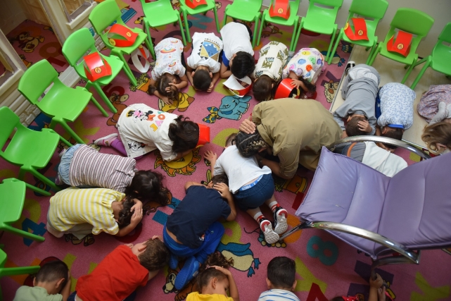 Çocukların yaşlarına uygun yöntemlerle; afetler öncesinde alınması gereken basit önlemler, deprem anında Çök–Kapan–Tutun davranışının önemi, yangın sırasında güvenli çıkış ve doğru davranış biçimleri anlatıldı.